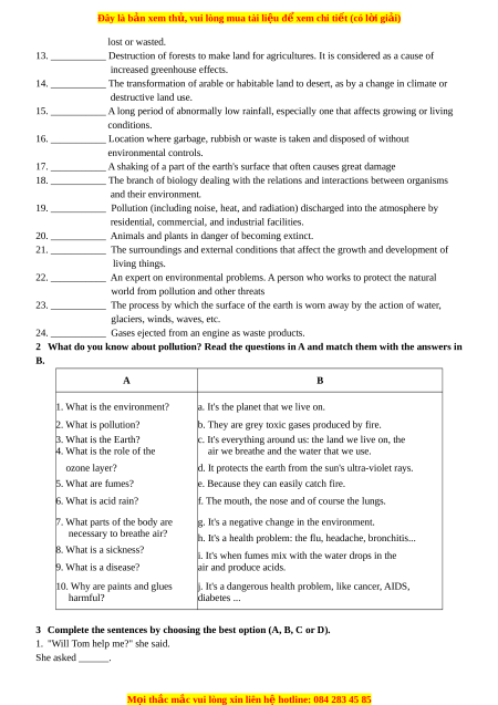 2 What do you know about pollution? Read the questions in A and match them with the answers in B. A B 1. What is the environment?