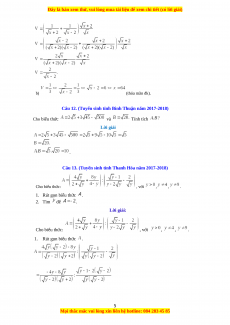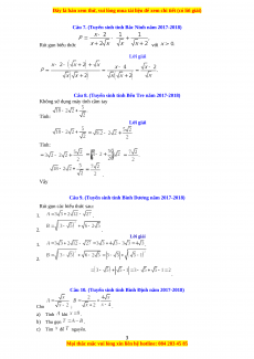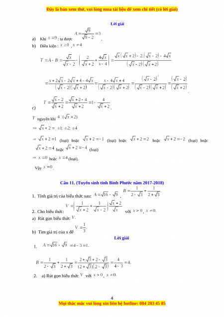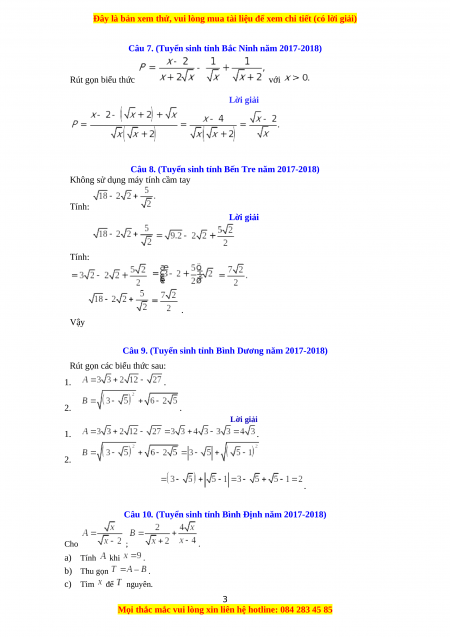 Câu 10. (Tuyển sinh tỉnh Bình Định năm 2017-2018) Cho ; . a) Tính khi . b) Thu gọn . c) Tìm để nguyên. 3