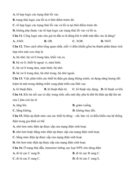 Câu 11. Cổng logic nào cho giá trị đầu ra là đúng khi ít nhất một đầu vào là đúng? A. AND. B. OR. C. XOR. D. NOT.