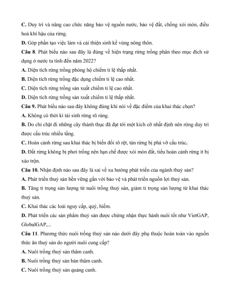 Câu 7. Phát biểu nào sau đây không đúng về ý nghĩa của bảo vệ và khai thác tài nguyên rừng bền vững?