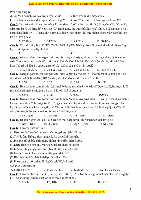 Câu 8. Hai kim loai X, Y và các dung dịch muối clorua của chúng có các phản ứng hóa học sau: X + 2YCl3 XCl2 + 2YCl2; Y + XCl2 YCl2 + X. 1