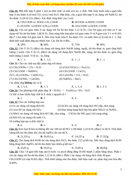 Câu 9. Để xác định độ rượu của một loại ancol etylic (kí hiệu là X) người ta lấy 10 ml X cho tác dụng hết