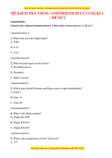 ĐỀ KIỂM TRA TIẾNG ANH FRIEND PLUS CUỐI KÌ 1 – ĐỀ SỐ 1 LISTENING