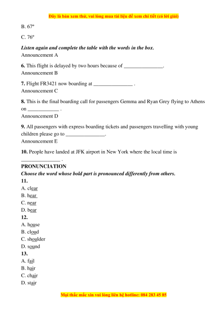 Choose the word whose bold part is pronounced differently from others. 11. A. clear B. hear C. near D. bear 12. A. house B. cloud C. shoulder D. sound 13. A. fail B. hair C. chair D. stair