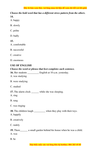 Choose the bold word that has a different stress pattern from the others. 14. A. happy B. slowly C. polite D. badly 15. A. comfortable B. successful C. creative D. enormous USE OF ENGLISH