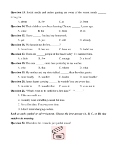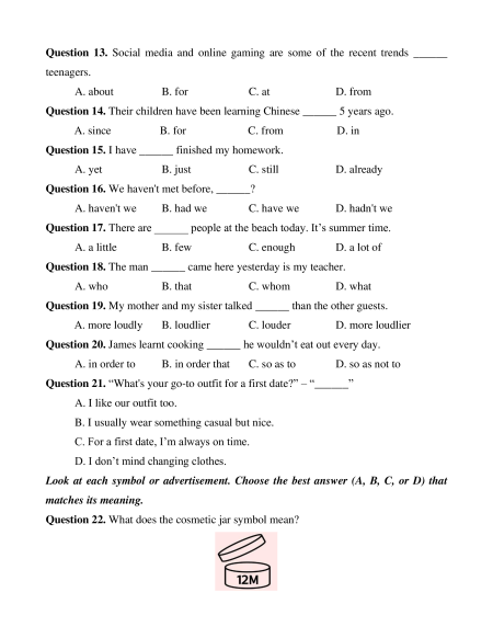Question 13. Social media and online gaming are some of the recent trends ______ teenagers. A. about B. for C. at D. from