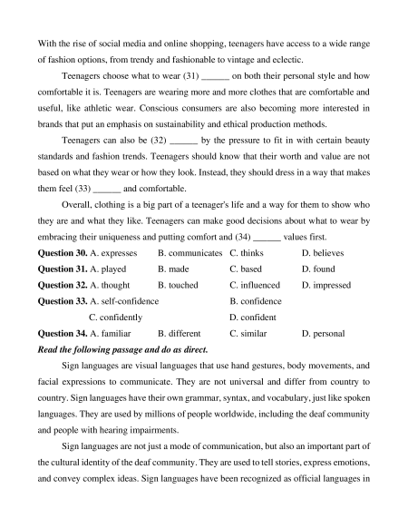 Clothing is a big part of how a teen (30) ______ himself or herself and shows his