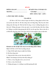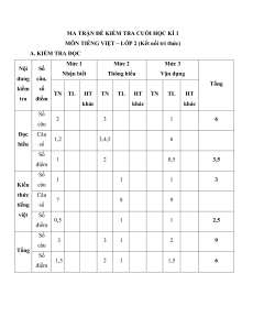MA TRẬN ĐỀ KIỂM TRA Kĩ Mạch kiến Số câu và số Mức 1 Mức 2 Mức 3 Tổng số năng thức, kĩ năng điểm TN TL TN TL TN TL TN TL Số câu 2 2 1 4 1 1. Đọc hiểu Số điểm 1 1 1 2 1 văn bản Câu số 1,2 3,4 5 Số câu 1 1 1 3 Đọc 2. Kiến thức Số điểm 1 1 1 3 Tiếng Việt Câu số 7 8 6 Số câu 2 1 2 2 1 4 4 Tổng cộng Số điểm 1 1 1 2 1 2 4 Số câu 1 Nghe viết Số điểm 4 Viết Viết đoạn Số câu 1 văn Số điểm 6 ĐỀ KIỂM TRA