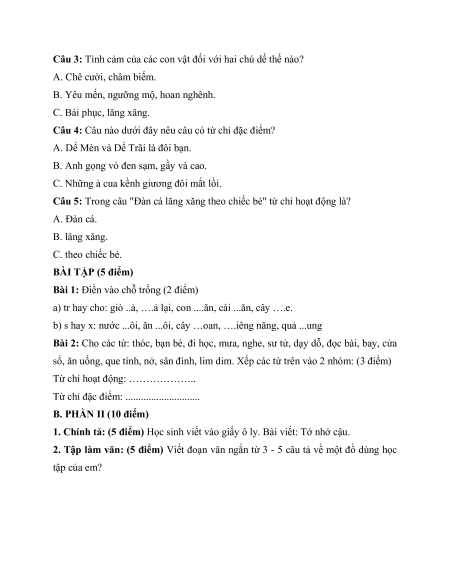 Câu 5: Trong câu "Đàn cá lăng xăng theo chiếc bè" từ chỉ hoạt động là? A. Đàn cá. B. lăng xăng. C. theo chiếc bè. BÀI TẬP (5 điểm)