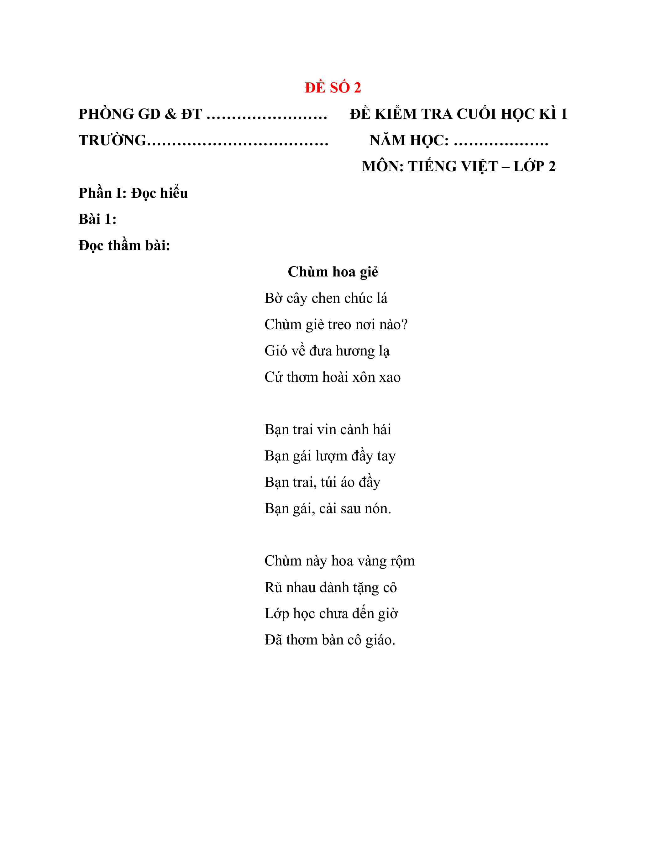 TIẾNG VIỆT 2 – KẾT NỐI TRI THỨC VỚI CUỘC SỐNG ĐỀ SỐ 1