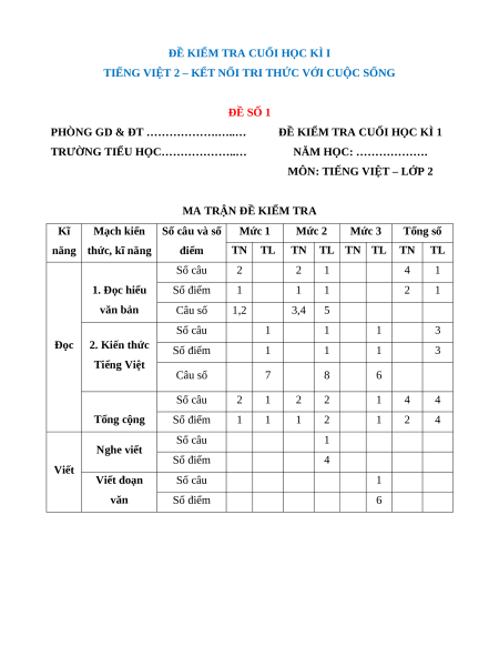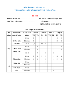 MÔN TIẾNG VIỆT – LỚP 2 (Kết nối tri thức) A. KIỂM TRA ĐỌC Mức 1 Mức 2 Mức 3 Nội Số Nhận biết Thông hiểu Vận dụng dung câu, Tổng kiểm số TN TL HT TN TL HT TN TL HT tra điểm khác khác khác Số 2 3 1 6 câu Đọc Câu 1,2 3,4,5 6 hiểu số Số 1 2 0,5 3,5 điểm Số 1 1 1 3 Kiến câu thức Câu 7 8 9 tiếng số việt Số 0,5 1 1 2,5 điểm Số 3 3 1 2 9 câu Tổng Số 1,5 2 1 1,5 6 điểm B. KIỂM TRA VIẾT Mức 1 Mức 2 Mức 3 Nội dung TT Nhận biết Thông hiểu Vận dụng Tổng kiểm tra TN TL TN TL TN TL Số 1 1 câu 1 Bài viết 1 Số 4 4 điểm Số 1 1 câu 2 Bài viết 2 Số 6 6 điểm Tổng số câu 1 1 2 Tổng số điểm 4 6 10 ĐỀ SỐ 1