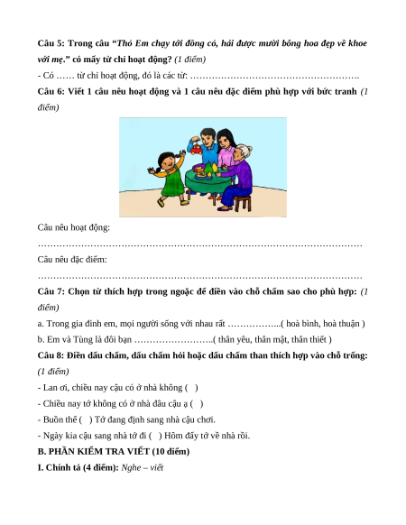 Câu 6: Viết 1 câu nêu hoạt động và 1 câu nêu đặc điểm phù hợp với bức tranh (1 điểm) Câu nêu hoạt động: