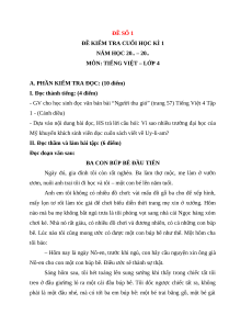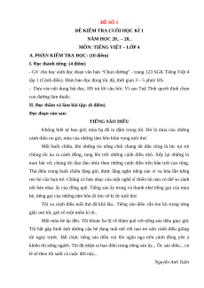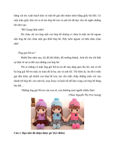Sau khi HS đọc thành tiếng xong GV đặt 01 câu hỏi để HS trả h Số lời. 4 tiếng điểm Số 2 1 3 câu Đọc Câu 1,2 3 hiểu số Số 1 0,5 1,5 điểm Số 2 2 4 Kiến câu thức Câu 4, 6 5, 7 tiếng số việt Số 2 2,5 4,5 điểm Số 2 1 2 2 8 câu Tổng Số 1 0,5 2 2,5 10 điểm