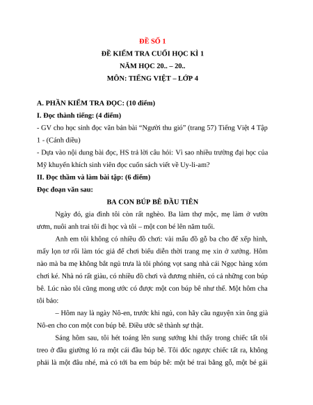 ĐỀ KIỂM TRA CUỐI HỌC KÌ 1
