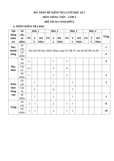 A. PHẦN KIỂM TRA ĐỌC Nội Số Mức 1 Mức 2 Mức 3 Mức 4 dung câu, Tổng kiểm số TN T HT TN T HT TN T HT TN T HT tra điểm L khác L khác L khác L khác Số Đọc 1 câu thành