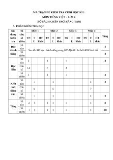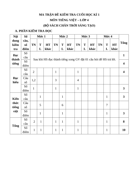 A. PHẦN KIỂM TRA ĐỌC Nội Số Mức 1 Mức 2 Mức 3 Mức 4 dung câu, Tổng kiểm số TN T HT TN T HT TN T HT TN T HT tra điểm L khác L khác L khác L khác Số Đọc 1 câu thành