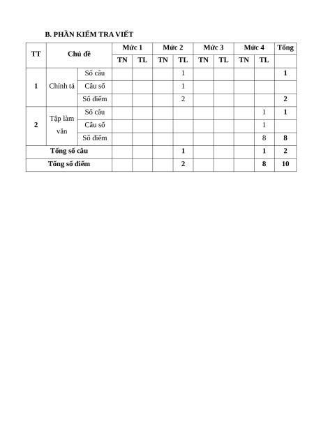 B. PHẦN KIỂM TRA VIẾT Mức 1 Mức 2 Mức 3 Mức 4 Tổng TT Chủ đề TN TL TN TL TN TL TN TL Số câu 1 1 1 Chính tả Câu số 1 Số điểm 2 2 Số câu 1 1 Tập làm 2 Câu số 1 văn Số điểm 8 8 Tổng số câu 1 1 2 Tổng số điểm 2 8 10 ĐỀ SỐ 1