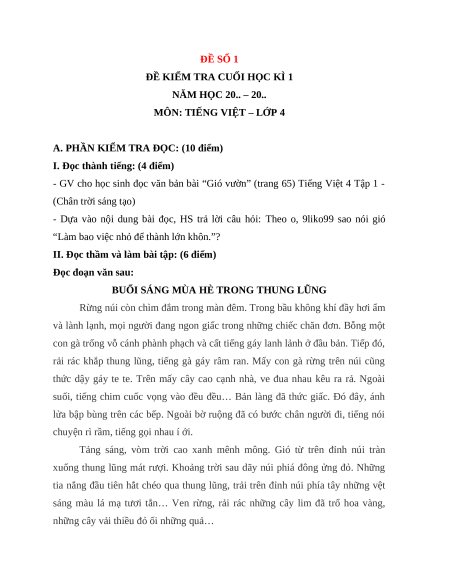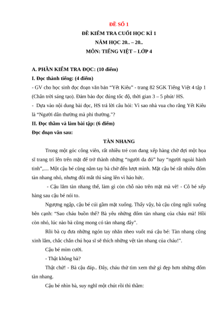 B. PHẦN KIỂM TRA VIẾT Mức 1 Mức 2 Mức 3 Tổng TT Chủ đề TN TL TN TL TN TL Số câu 1 1 1 Chính tả Câu số 1 Số điểm 4 4 Số câu 1 1 Tập làm 2 Câu số 2 văn Số điểm 6 6 Tổng số câu 1 1 2 Tổng số điểm 4 6 10 ĐỀ SỐ 1