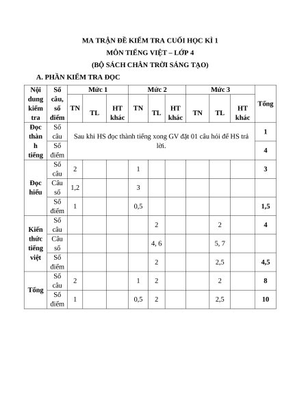 A. PHẦN KIỂM TRA ĐỌC Nội Số Mức 1 Mức 2 Mức 3 dung câu, Tổng kiểm số TN HT TN HT HT TL TL TN TL tra điểm khác khác khác Đọc Số 1 thàn câu