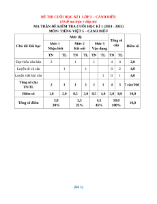 MÔN: TIẾNG VIỆT 5 – CÁNH DIỀU Mức độ Tổng số Mức 1 Mức 2 Mức 3 Chủ đề/ Bài học câu Điểm số Nhận biết Kết nối Vận dụng TN TL TN TL TN TL TN TL Đọc hiểu văn bản 2 1 1 4 0 2,0 Luyện từ và câu 1 1 0 2 4,0 Luyện viết bài văn 1 0 1 4,0 Tổng số câu 2 1 1 1 1 1 4 3 7 câu/10đ TN/TL Điểm số 1,0 2,0 0,5 2,0 0,5 4,0 2,0 8,0 10,0 3,0 2,5 4,5 10,0 Tổng số điểm 10,0 30% 25% 45% 100% (Đề 1)