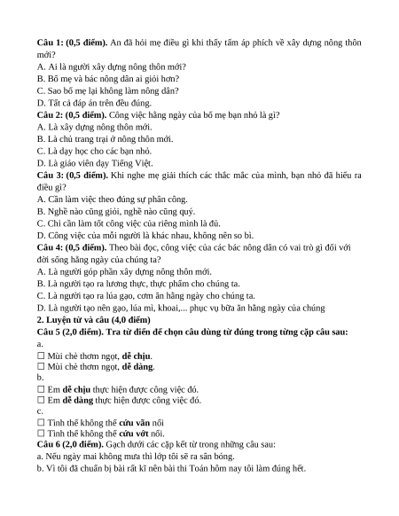 b. Mẹ cho con mấy quyển vở ạ? Ai giúp một tay Cày bừa ruộng đất? (Võ Quảng) Câu 6 (2,0 điểm):