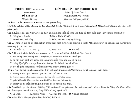 Môn: Lịch sử - Lớp: 11 ĐỀ THI SỐ: 01