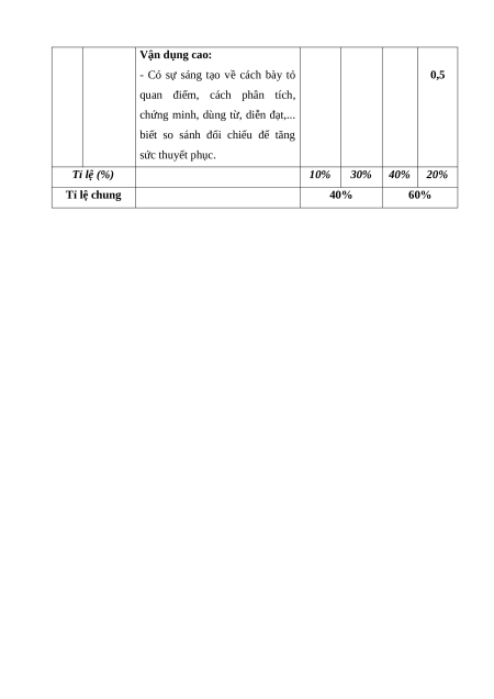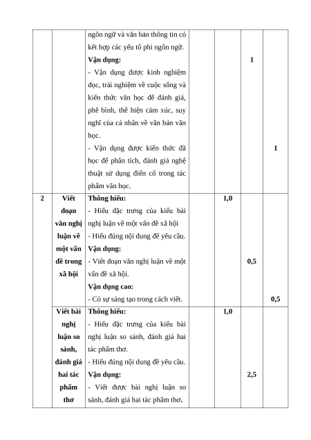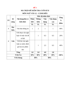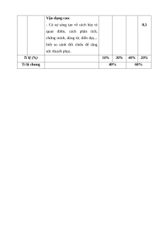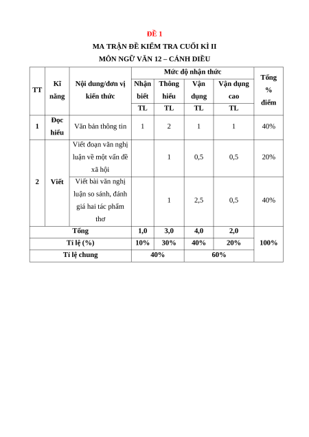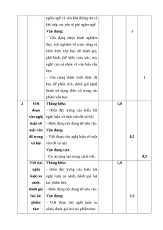 Nội dung/đơn vị Nhận Thông Vận Vận dụng TT % năng kiến thức biết hiểu dụng cao điểm TL TL TL TL Đọc 1 Văn bản thông tin 1 2 1 1 40% hiểu Viết đoạn văn nghị luận về một vấn đề 1 0,5 0,5 20% xã hội 2 Viết Viết bài văn nghị luận so sánh, đánh 1 2,5 0,5 40% giá hai tác phẩm thơ Tổng 1,0 3,0 4,0 2,0 Tỉ lệ (%) 10% 30% 40% 20% 100% Tỉ lệ chung 40% 60%