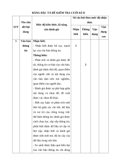 BẢNG ĐẶC TẢ ĐỀ KIỂM TRA CUỐI KÌ II