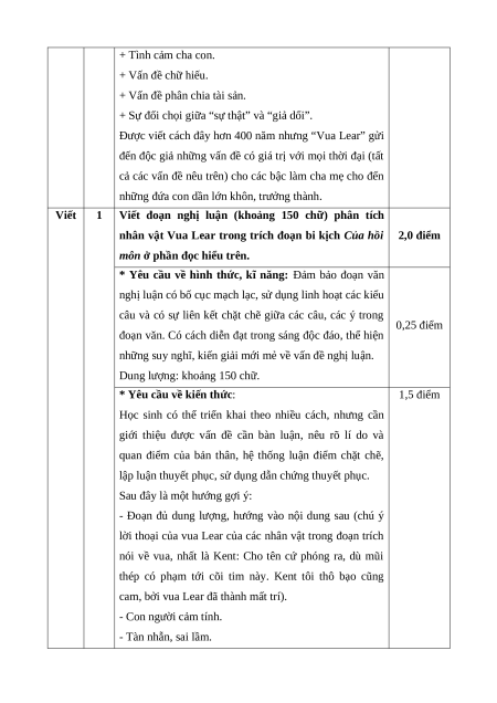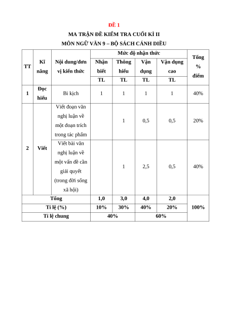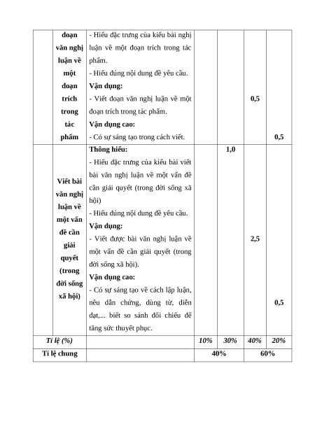 Mức độ nhận thức Tổng Kĩ Nội dung/đơn Nhận Thông Vận Vận dụng TT % năng vị kiến thức biết hiểu dụng cao điểm TL TL TL TL Đọc 1 Bi kịch 1 1 1 1 40% hiểu Viết đoạn văn nghị luận về 1 0,5 0,5 20% một đoạn trích trong tác phẩm Viết bài văn 2 Viết nghị luận về một vấn đề cần 1 2,5 0,5 40% giải quyết (trong đời sống xã hội) Tổng 1,0 3,0 4,0 2,0 Tỉ lệ (%) 10% 30% 40% 20% 100% Tỉ lệ chung 40% 60%