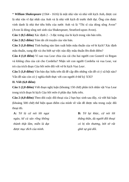 Vua Lear là bi kịch kinh điển của nhà văn William Shakespeare gồm 5 hồi. Khi thấy