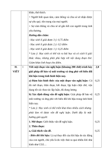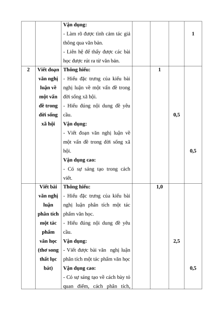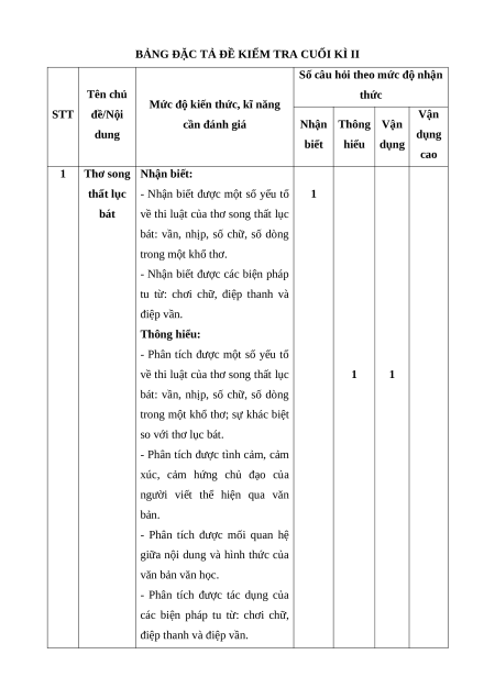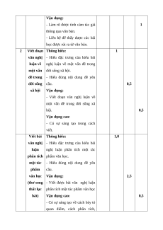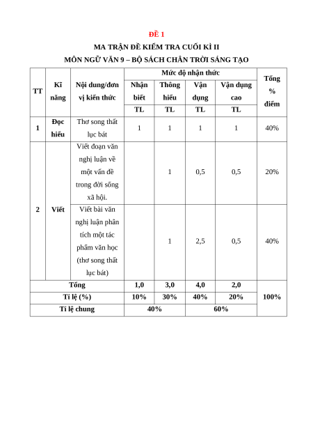 Mức độ nhận thức Tổng Kĩ Nội dung/đơn Nhận Thông Vận Vận dụng TT % năng vị kiến thức biết hiểu dụng cao điểm TL TL TL TL Đọc Thơ song thất 1 1 1 1 1 40% hiểu lục bát Viết đoạn văn nghị luận về một vấn đề 1 0,5 0,5 20% trong đời sống xã hội. 2 Viết Viết bài văn nghị luận phân tích một tác 1 2,5 0,5 40% phẩm văn học (thơ song thất lục bát) Tổng 1,0 3,0 4,0 2,0 Tỉ lệ (%) 10% 30% 40% 20% 100% Tỉ lệ chung 40% 60%