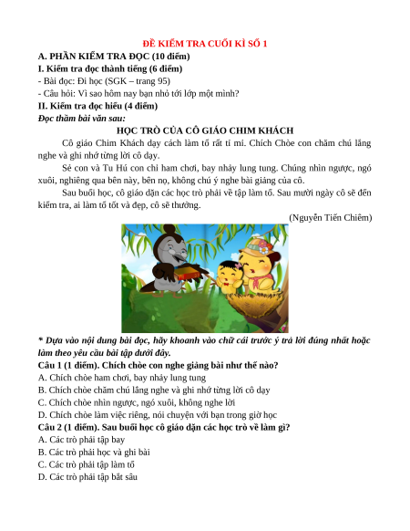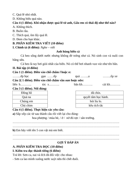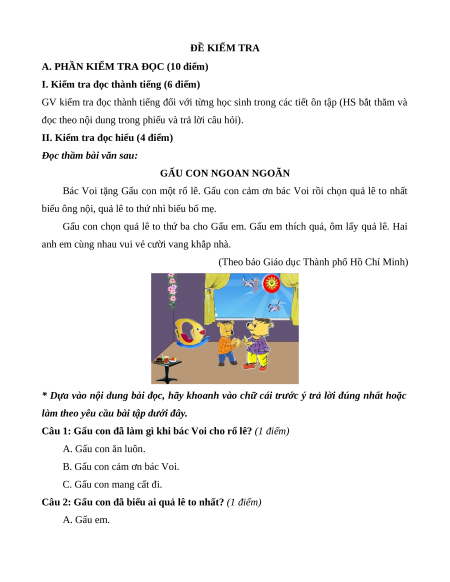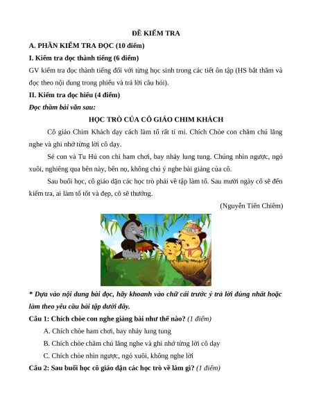 A. PHẦN KIỂM TRA ĐỌC (10 điểm)