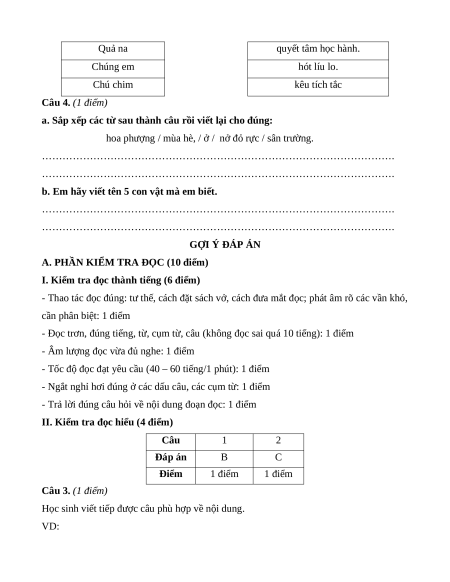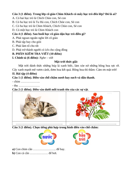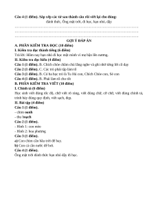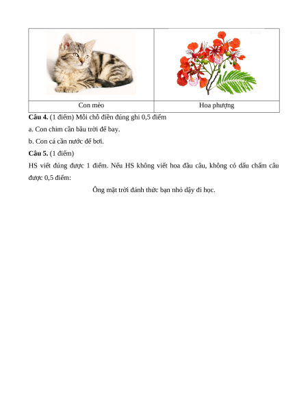 trình bày đúng quy định, viết sạch, đẹp. II. Bài tập (4 điểm) Câu 1 (1 điểm). - chim oanh - thu hoạch Câu 2 (1 điểm). - Hình 1: con mèo - Hình 2: hoa phượng Câu 3 (1 điểm).