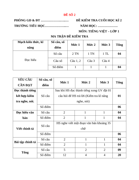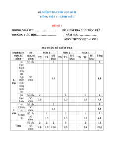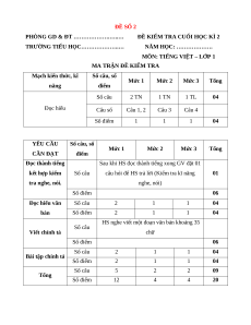 MA TRẬN ĐỀ KIỂM TRA Mạch kiến Số Mức 1 Mức 2 Mức 3 thức, kĩ câu, số HT HT HT Tổng TN TL TN TL TN TL năng điểm khác khác khác a) Số câu 1 1 Đọc thành tiếng kết hợp Số 6,0 6,0 1. kiểm điểm Đọc tra kĩ năng nghe nói b) Số câu 2 1 1 4 Đọc Số 2,0 1,0 1,0 4,0 hiểu điểm a) Số câu 1 1 Chính Số 6,0 6,0 2. tả điểm Viết Số câu 2 2 1 5 b) Bài Số tập 1,5 1,5 1,0 4,0 điểm Số câu 2 2 2 3 2 11 Tổng Số 2,0 1,5 12,0 2,5 2,0 20,0 điểm ĐỀ KIỂM TRA