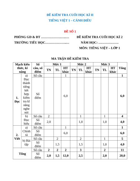TIẾNG VIỆT 1 – CÁNH DIỀU ĐỀ SỐ 1