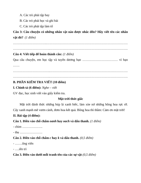 Câu 2: Sau buổi học cô giáo dặn các học trò về làm gì? (1 điểm) A. Các trò phải tập bay