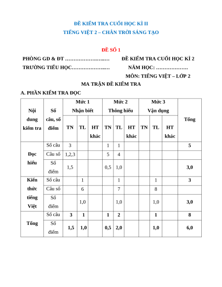MÔN TIẾNG VIỆT – LỚP 2 (Chân trời sáng tạo) A. KIỂM TRA ĐỌC Mức 1 Mức 2 Mức 3 Nội Số Nhận biết Thông hiểu Vận dụng dung câu, Tổng kiểm số TN TL HT TN TL HT TN TL HT tra điểm khác khác khác Số 2 3 1 6 câu Đọc Câu 1,2 3,4,5 6 hiểu số Số 1 2 0,5 3,5 điểm Số 1 1 1 3 Kiến câu thức Câu 7 8 9 tiếng số việt Số 0,5 1 1 2,5 điểm Số 3 3 1 2 9 câu Tổng Số 1,5 2 1 1,5 6 điểm B. KIỂM TRA VIẾT Mức 1 Mức 2 Mức 3 Nội dung TT Nhận biết Thông hiểu Vận dụng Tổng kiểm tra TN TL TN TL TN TL Số 1 1 câu 1 Bài viết 1 Số 4 4 điểm Số 1 1 câu 2 Bài viết 2 Số 6 6 điểm Tổng số câu 1 1 2 Tổng số điểm 4 6 10 ĐỀ SỐ 1