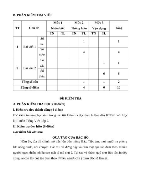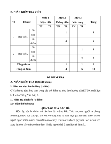 B. PHẦN KIỂM TRA VIẾT Mức 1 Mức 2 Mức 3 TT Chủ đề Nhận biết Thông hiểu Vận dụng Tổng TN TL TN TL TN TL Số 1 1 câu 1 Bài viết 1 Số 4 4 điểm Số 1 1 câu 2 Bài viết 2 Số 6 6 điểm Tổng số câu 1 1 2 Tổng số điểm 4 6 10 ĐỀ KIỂM TRA