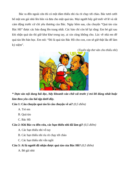 Câu 1: Câu chuyện quả táo là câu chuyện về ai? (0,5 điểm) A. Trẻ em B. Quả táo C. Bác Hồ