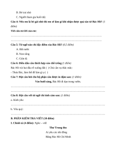Câu 5: Từ ngữ nào chỉ đặc điểm của Bác Hồ? (0,5 điểm) A. Đất nước B. Non sông C. Giản dị