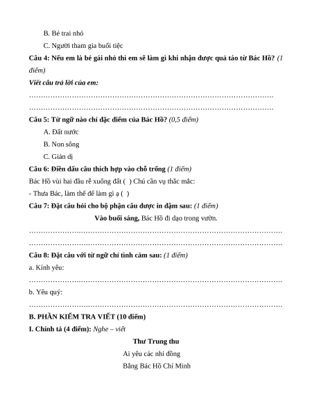 I. Chính tả (4 điểm): Nghe – viết Thư Trung thu Ai yêu các nhi đồng Bằng Bác Hồ Chí Minh