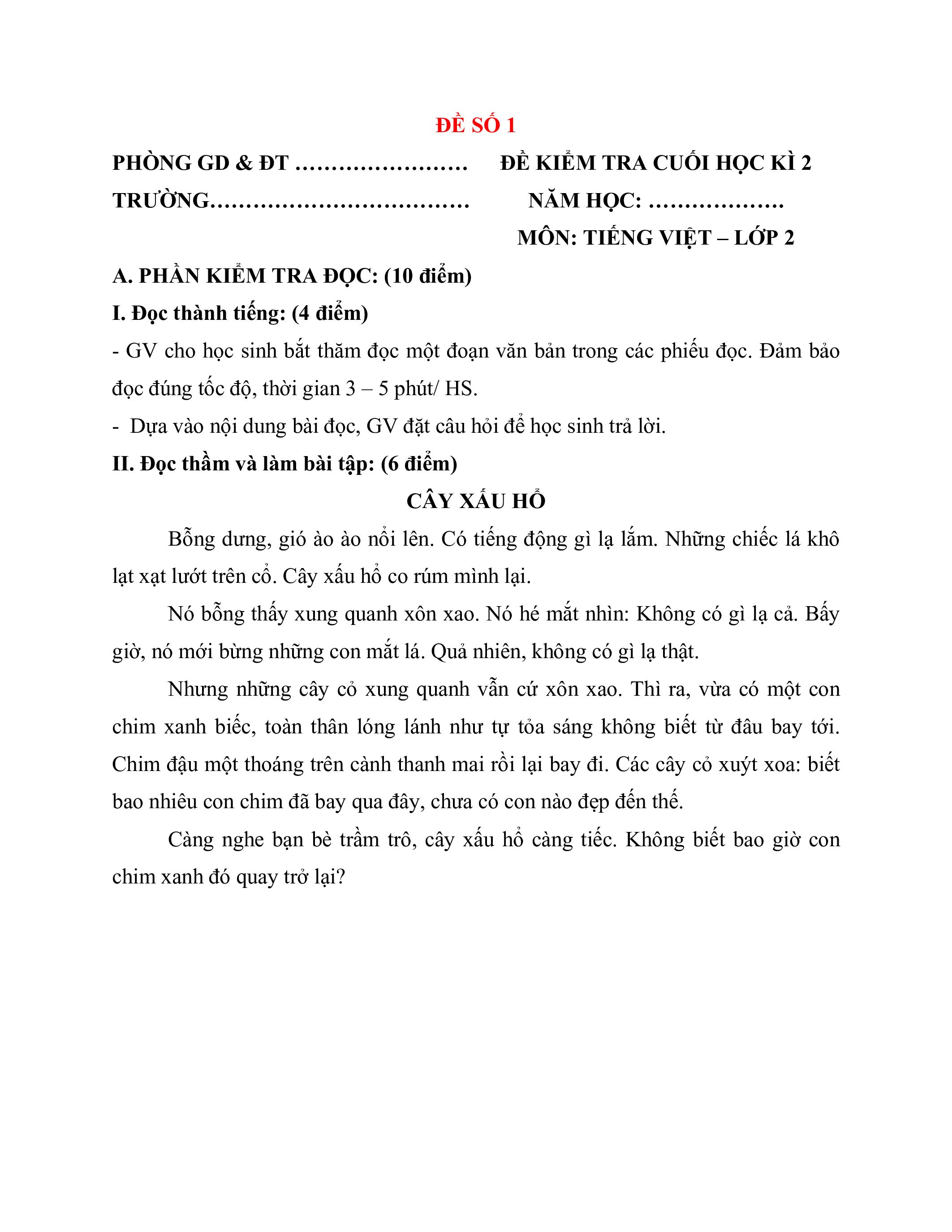 TIẾNG VIỆT 2 – CHÂN TRỜI SÁNG TẠO ĐỀ SỐ 1