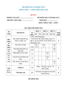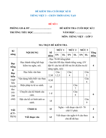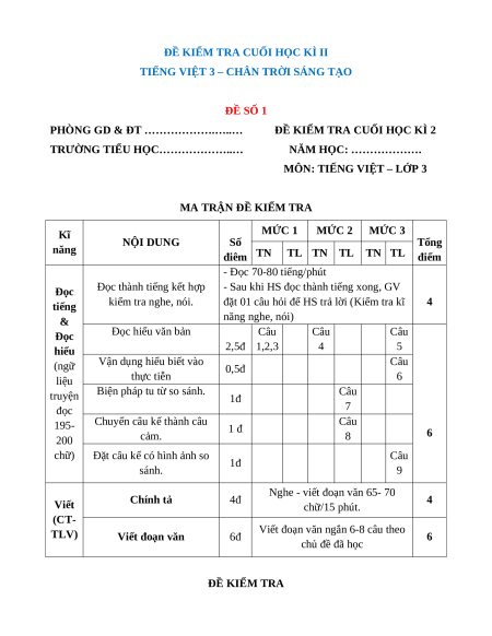 TIẾNG VIỆT 3 – CHÂN TRỜI SÁNG TẠO ĐỀ SỐ 1