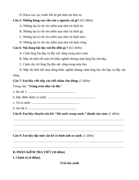 Đặt câu kể có hình ảnh so sánh. 1đ Câu 9 Viết Chính tả 4đ
