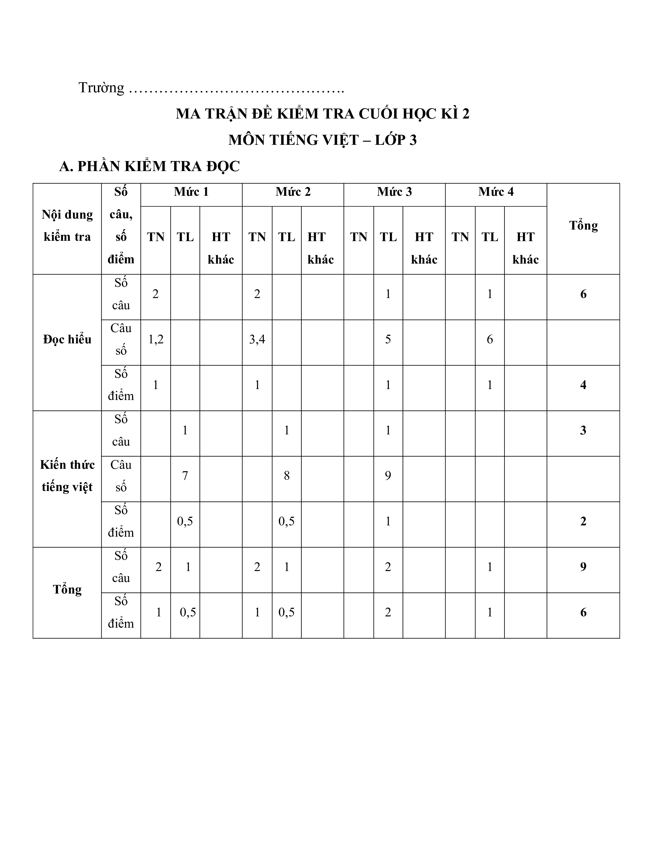A. PHẦN KIỂM TRA ĐỌC Số Mức 1 Mức 2 Mức 3 Mức 4 Nội dung câu, Tổng kiểm tra số TN TL HT TN TL HT TN TL HT TN TL HT điểm khác khác khác khác Số 2 2 1 1 6 câu Câu Đọc hiểu 1,2 3,4 5 6 số Số 1 1 1 1 4 điểm Số 1 1 1 3 câu Kiến thức Câu 7 8 9 tiếng việt số Số 0,5 0,5 1 2 điểm Số 2 1 2 1 2 1 9 câu Tổng Số 1 0,5 1 0,5 2 1 6 điểm