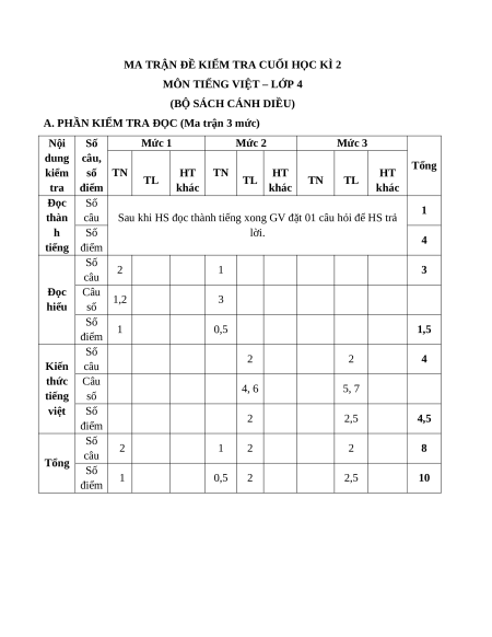 A. PHẦN KIỂM TRA ĐỌC (Ma trận 3 mức) Nội Số Mức 1 Mức 2 Mức 3 dung câu, Tổng kiểm số TN HT TN HT HT TL TL TN TL tra điểm khác khác khác Đọc Số 1 thàn câu