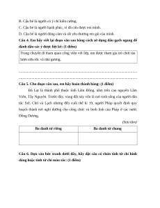 Sau khi HS đọc thành tiếng xong GV đặt 01 câu hỏi để HS trả h Số lời. 4 tiếng điểm Số 2 1 3 câu Đọc Câu 1,2 3 hiểu số Số 1 0,5 1,5 điểm Số 2 2 4 Kiến câu thức Câu 4, 6 5, 7 tiếng số việt Số 2 2,5 4,5 điểm Số 2 1 2 2 8 câu Tổng Số 1 0,5 2 2,5 10 điểm
