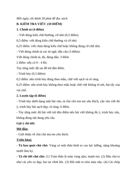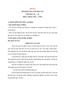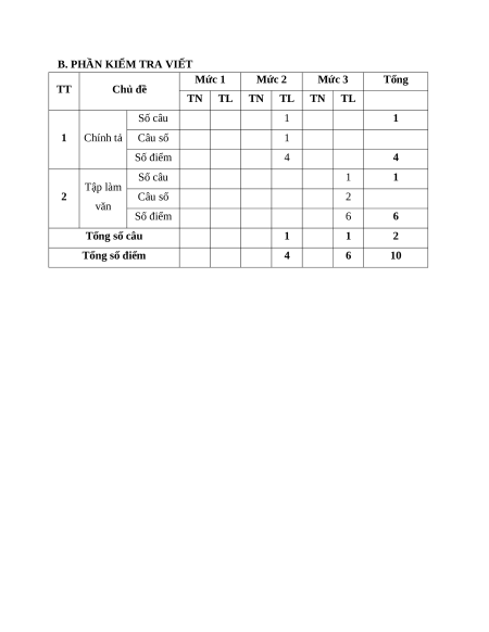 B. PHẦN KIỂM TRA VIẾT Mức 1 Mức 2 Mức 3 Tổng TT Chủ đề TN TL TN TL TN TL Số câu 1 1 1 Chính tả Câu số 1 Số điểm 4 4 Số câu 1 1 Tập làm 2 Câu số 2 văn Số điểm 6 6 Tổng số câu 1 1 2 Tổng số điểm 4 6 10 ĐỀ SỐ 1