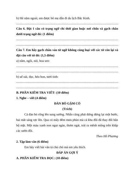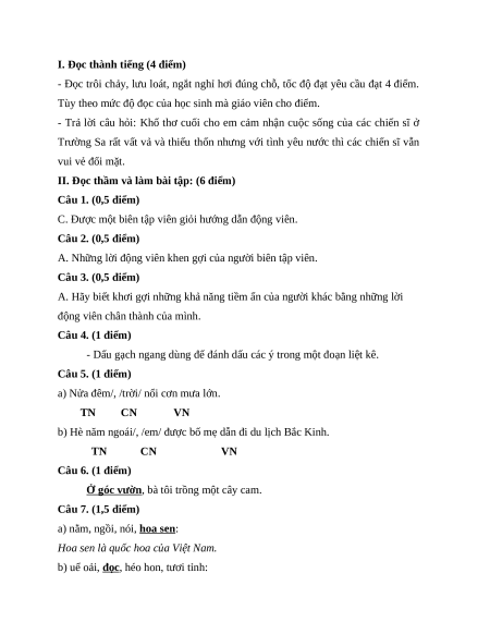A. PHẦN KIỂM TRA ĐỌC: (10 điểm)