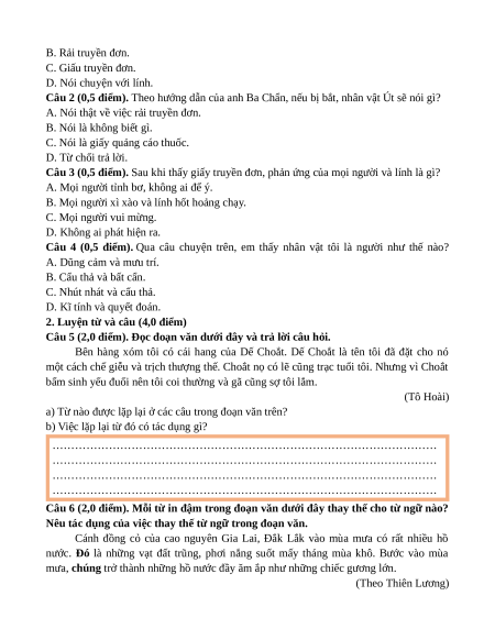 Câu 1 (0,5 điểm). Công việc đầu tiên mà anh Ba Chẩn giao cho nhân vật "tôi" trong đoạn văn là gì? A. Bán cá ở chợ. B. Rải truyền đơn. C. Giấu truyền đơn. D. Nói chuyện với lính.
